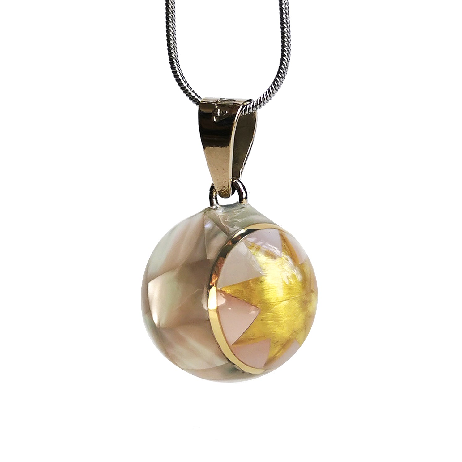 Está elaborado artesanalmente en resina y madreperla con una esfera interior que produce un bello sonido que evoca armonía.