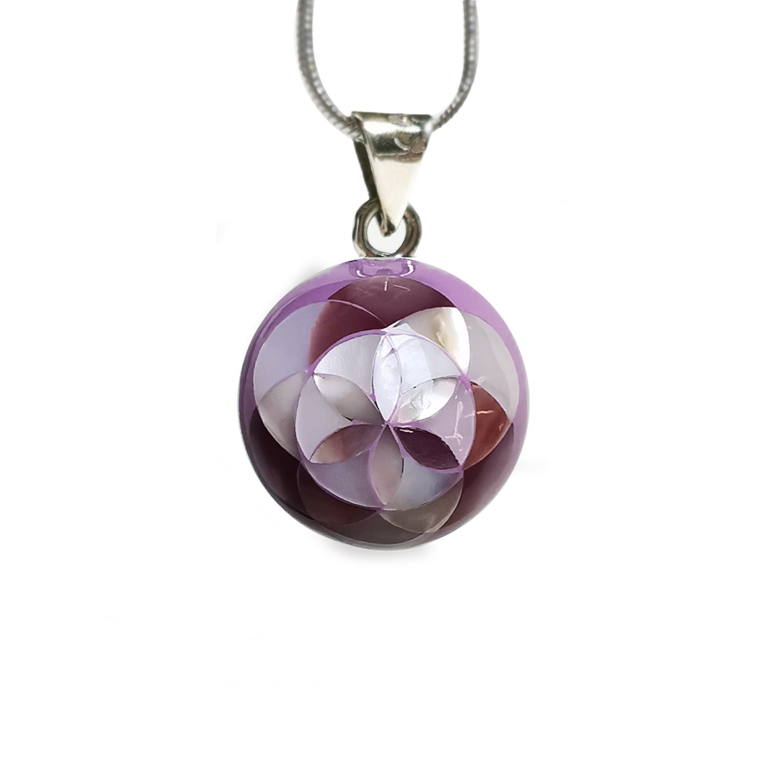 Está elaborado artesanalmente en resina color arena con madreperla rosa y blanco y una esfera interior que produce un bello sonido que evoca armonía. Tamaño 20mm.