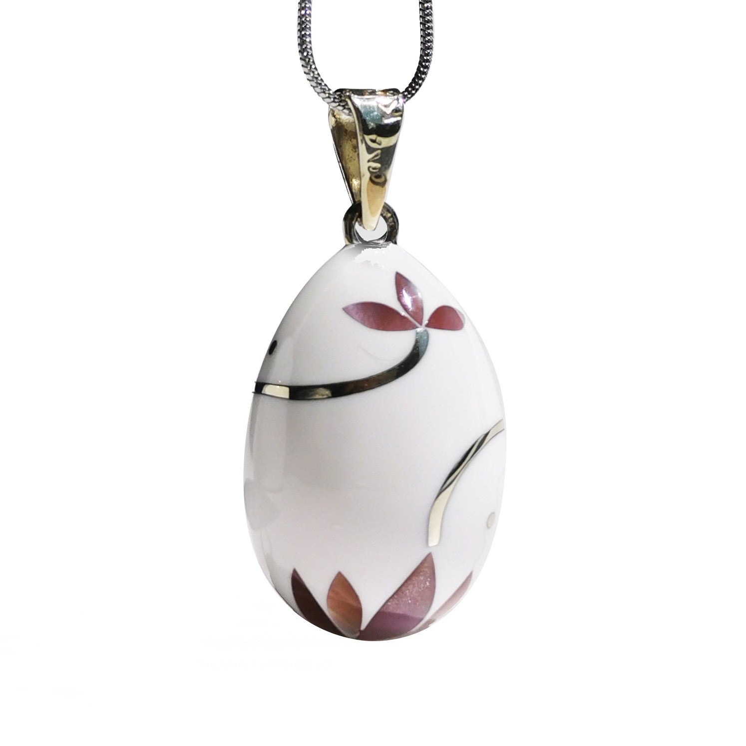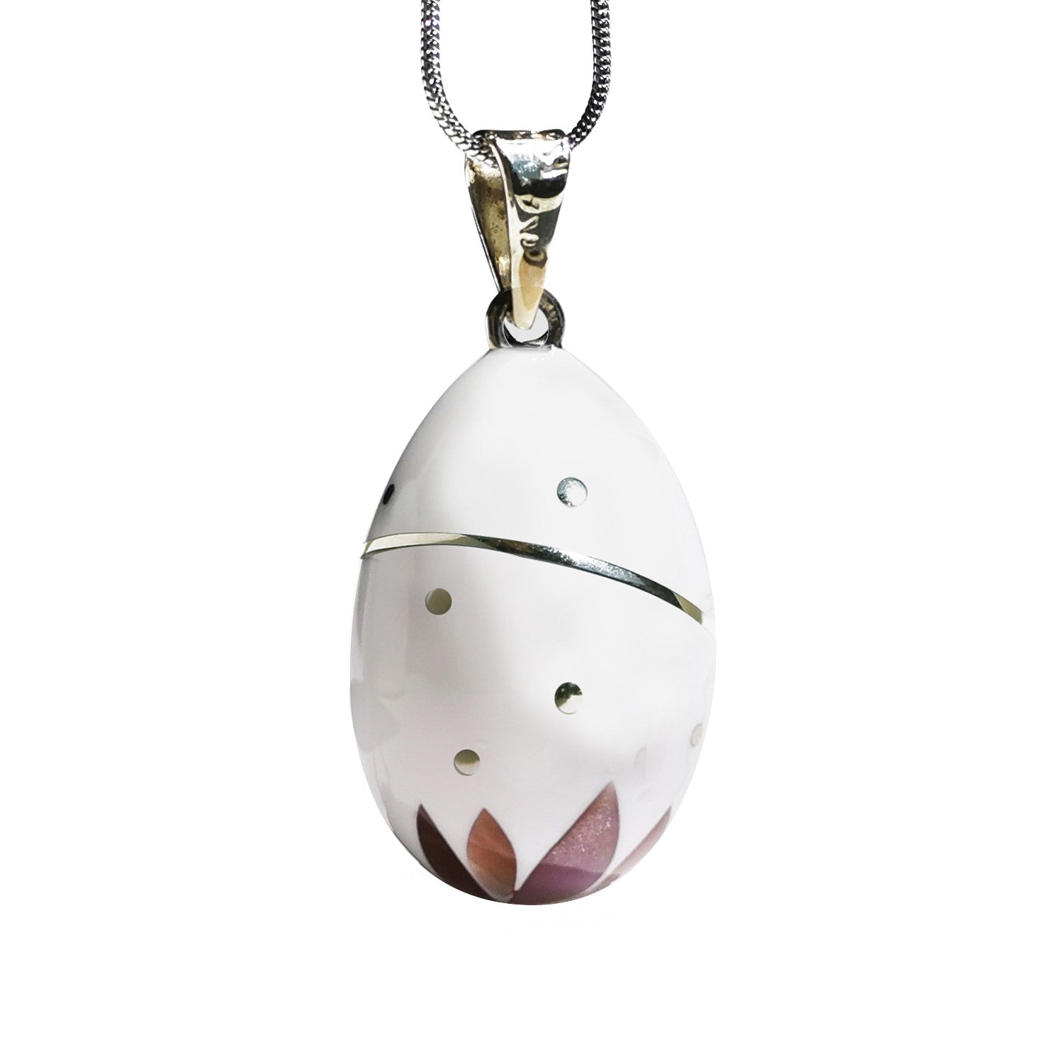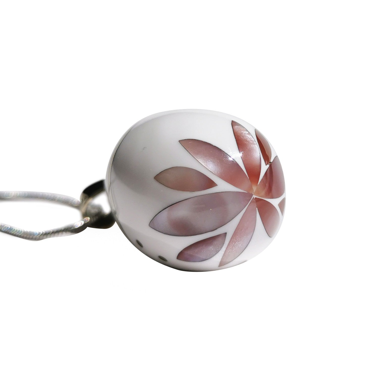Está elaborado artesanalmente en resina y madreperla color rosa, con una esfera interior que produce un bello sonido que evoca armonía. Tamaño 37mm de largo, 25mm diámetro.