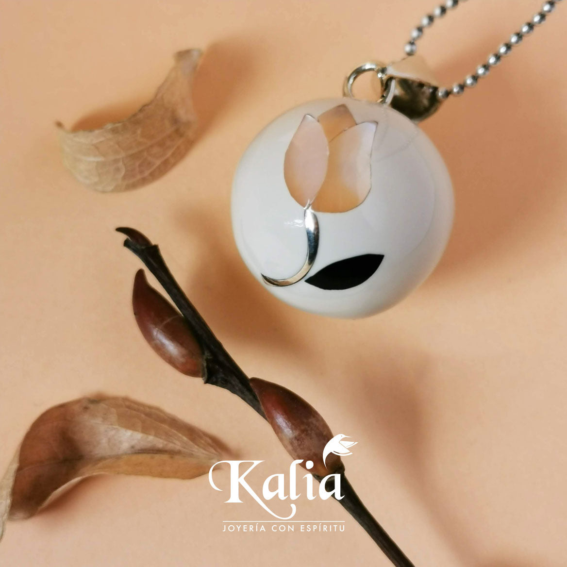 Está elaborado artesanalmente en resina y madreperla con una esfera interior que produce un bello sonido que evoca armonía. Tamaño 20mm.